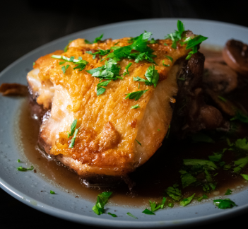 Куриное филе, сливочный соус из шампиньонов и лука, рис пилав, вермишель, зелень.